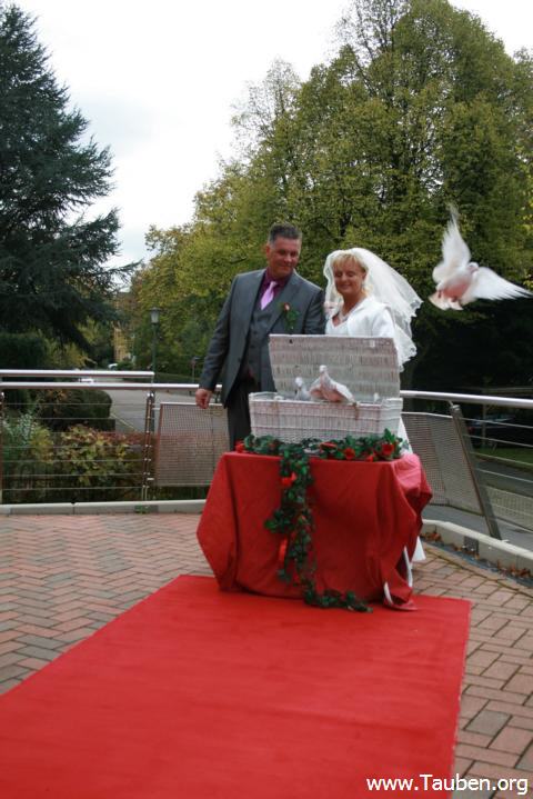 Bei passender Gelegenheit führen Sie das Brautpaar über den roten Teppich zum Korb mit den Hochzeitstauben. Wir übernehmen dann und erklären kurz, wie man eine Taube in die Hand nehmen kann, wenn dieses vom Brautpaar gewünscht wird.