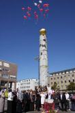 ..... die Idee dem Brautpaar zwei weiße Herzluftballons in die Hände zu geben war genial. Die beiden Fotografen waren beim Start der Helium Luftballons von den 48 roten Luftballons und den 2 weißen Helium Luftballons am blauen Himmel begeistert.